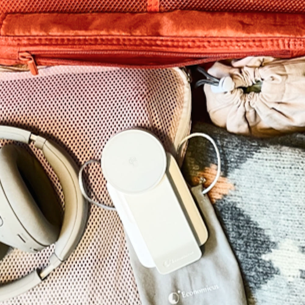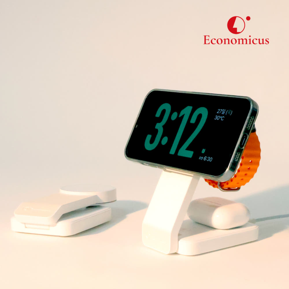 침대 옆 협탁에서 사용한다면 이코노미쿠스 무선 충전기가 제격입니다. 부드러운 LED 램프 기능이 포함되어 있어 밤에 폰을 찾기 쉽고, 가성비 넘치는 가격에 맥세이프 링까지 증정하고 있습니다.