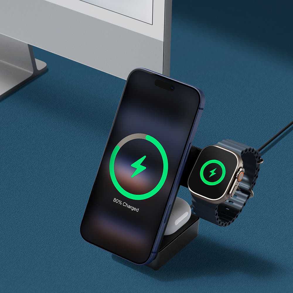 A2. 네, 세 제품 모두 스마트폰, 스마트워치, 무선 이어폰을 동시에 충전할 수 있는 3in1 일체형 구조입니다.